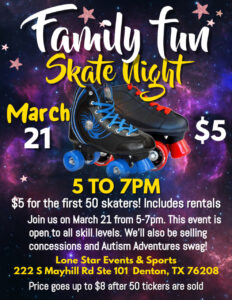 Come join us for our second annual Family Fun Skate Night on March 21 from 5-7pm. This event will be held at the Lone Star Events & Sports Center in Denton. The event will be $5 for the first 50 skaters and includes rentals. Price will increase to $8 per skater after the first 50 tickets are sold. Watching is free! We will also be selling concessions and Autism Adventures swag. Be sure to reserve your spot today. Space is limited!